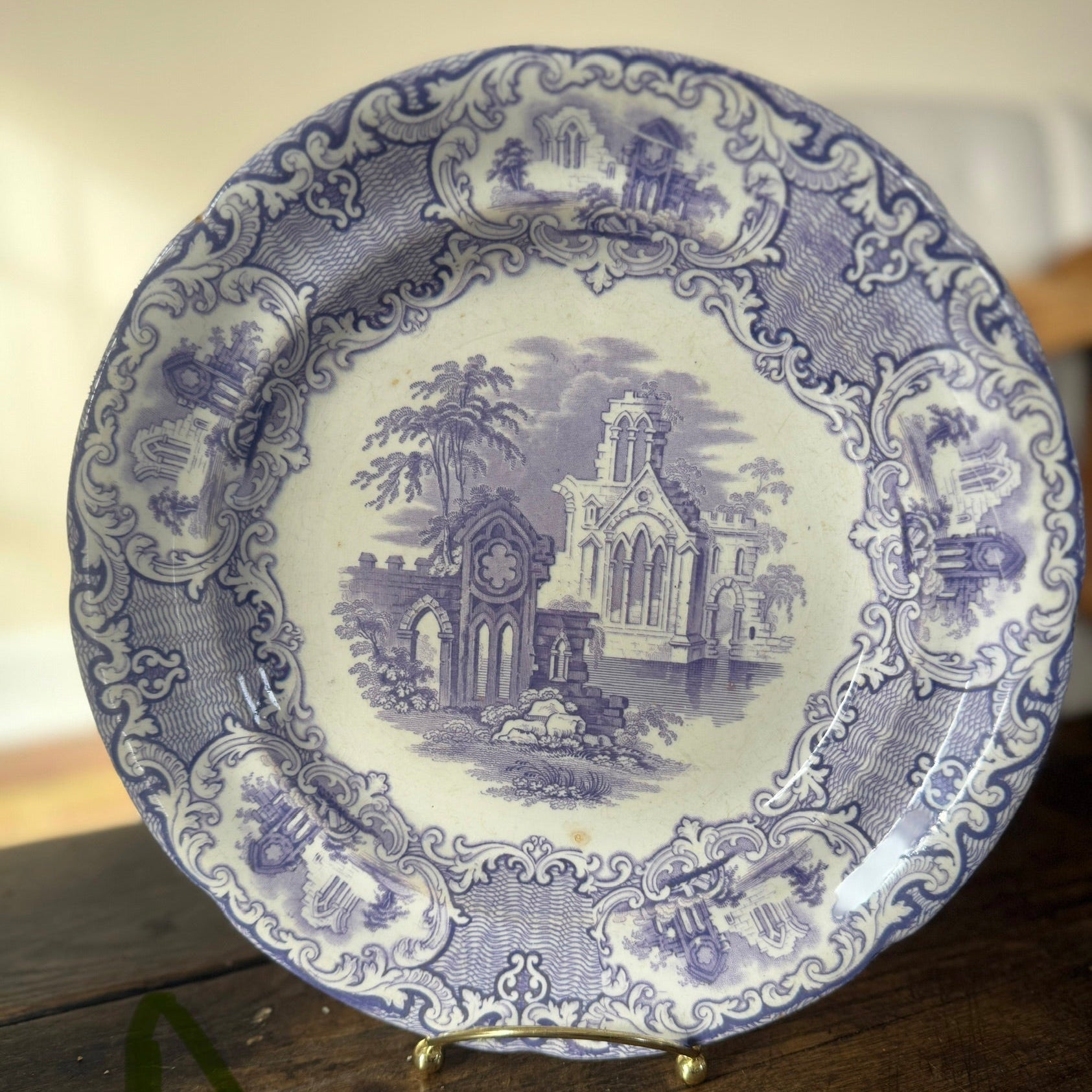 Antique Lavender Transferware Plate A, Glaze Pop on Front with Minor Discoloration